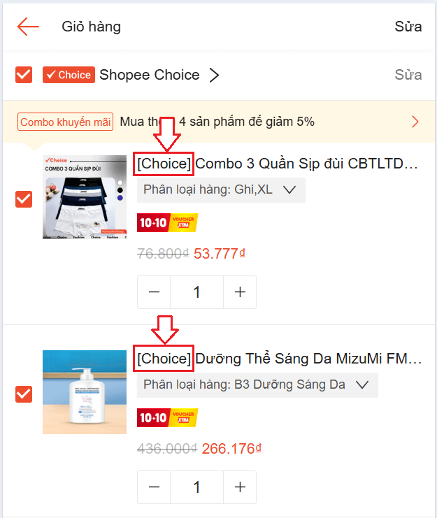• Trong giỏ, chỉ tick những item có nhãn Choice để hưởng đúng ưu đãi.